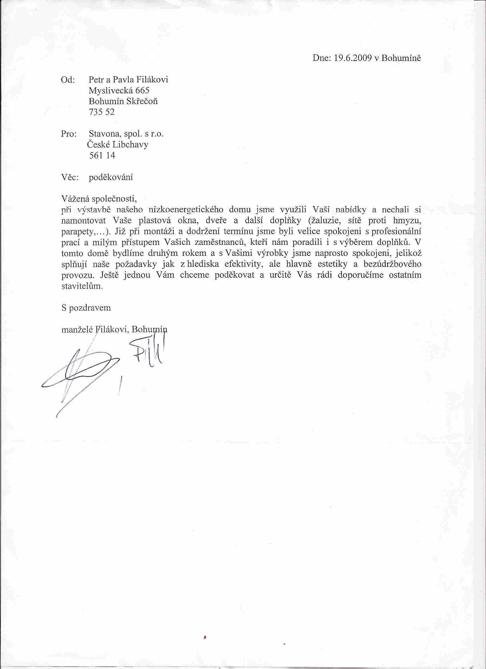 Vážení, dovolte mi, touto cestou, srdečně poděkovat za perfektní spolupráci a skvěle odvedenou práci v průběhu uplynulých 4 let vašeho pracovníka pana Pípala. V těchto letech jsme postupně rekonstruovali budovu naší mateřské školy včetně výměny oken. Pan Pípal nám vždy vyšel vstříc, dodržel dohodnuté schůzky, inicioval dodržení termínů montáže, vždy odvedl perfektní profesionální práci. Těším se na případně další spolupráci.